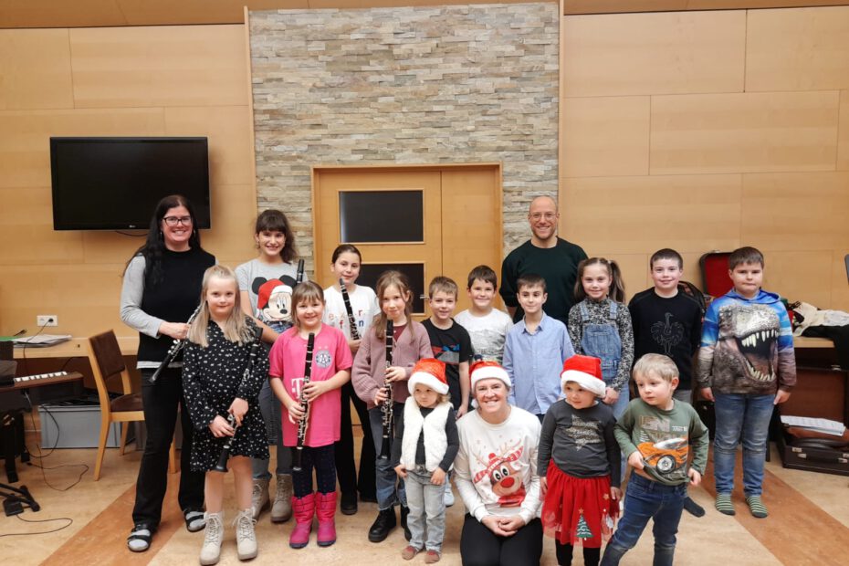Ein paar Tage vor Weihnachten musizieren die Früherziehungsgruppen, Holzbläser und Schüler auf der Steirischen Harmonika und freuen sich auf das Christkind
